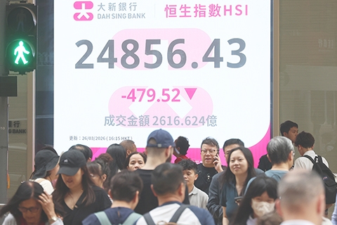 【香港中通社3月26日電】(記者譚暢)港股26日向下,恆生指數當日跌479點或1.9%,報24856點。大市全日成交額約為2616.62億港元。 當天,恆指低開68點,其後跌幅擴大,一度跌542點低見24793點;全日收報24856點。國企指數跌192點或2.25%,報8389點;恆生科技指數跌1…