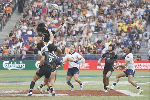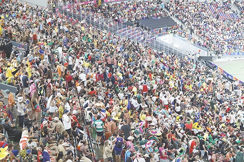 【香港中通社四月十八日電】(記者 徐嘉儀)為期三天的香港國際七人欖球賽十八日踏入第二天賽程,不少球迷一早盛裝打扮前往啟德體育園,投入年度最狂熱的「七欖派對」。現場人潮湧湧,截至下午二時四十五分,主場館南看台及二樓觀賽區人數已達上限。 南看台是香港國際七人欖球賽最「瘋狂」的區域,被譽為七欖的「狂歡聖…