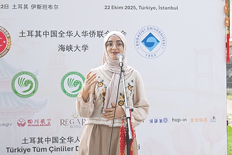 ◎ 十月二十二日,第二屆中國文化節在土耳其伊斯坦布爾海峽大學舉行。圖為當日,土耳其學生在伊斯坦布爾舉行的中國文化節上用中文朗誦詩歌。(新華社記者 劉磊 攝)