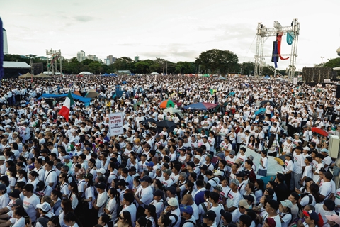 ◎ 十一月十六日,在菲律賓馬尼拉的黎薩爾公園舉行的為期三天的反腐敗集會上,基督教會的成員聚集在一起。(美聯社圖片/馬克.克利斯蒂諾)