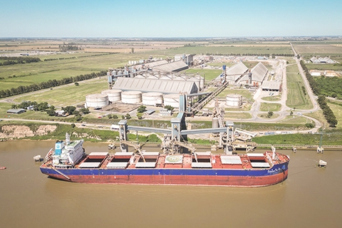 ◎ 這是十二月十三日在阿根廷聖菲省廷布埃斯港拍攝的裝載小麥的貨輪(無人機照片)。一艘裝載六萬五千噸阿根廷小麥的貨輪當日從該國聖菲省廷布埃斯港啟航前往中國。這是阿根廷二0二四年一月獲得對華小麥出口資質後首次向中國開展小麥商業出口。(新華社發 馬丁·薩巴拉 攝)