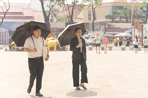 ◎ 近日老撾多地最高氣溫達到攝氏四十度。圖為四月二日,人們行走在老撾首都萬象街頭。(新華社發 凱喬 攝)