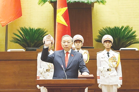 ◎ 經越南第十六屆國會第一次會議4月7日投票表決,越南共產黨中央總書記蘇林當選越南國家主席。圖為當日,在越南首都河內,蘇林宣誓就任越南國家主席。(新華社/越通社)