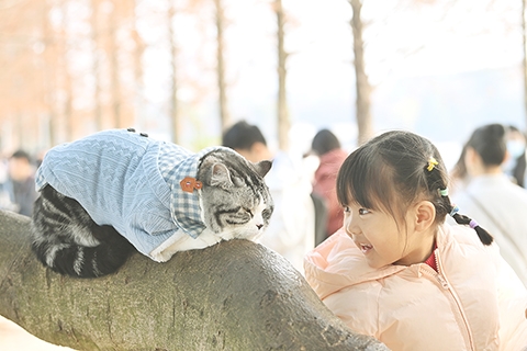 ◎ 十二月十八日,位於長沙的湖南烈士公園內,網紅小貓「滾滾」吸引眾多遊客駐足拍照。它多日來霸佔樹枝當座位,呆萌可愛的模樣吸引大批遊客專程前來拍照「打卡」。圖為小朋友與小貓互動。(中新社記者 楊華峰 攝)