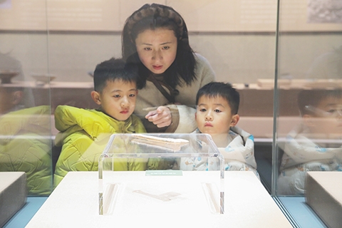 ◎ 二月七日,家長和小朋友在「江海起源 文明之光——青墩遺址出土文物『回鄉』展」欣賞展品。當日,「江海起源 文明之光——青墩遺址出土文物『回鄉』展」在江蘇省海安市博物館啟幕。本次展覽匯集了包括國家一級文物有柄穿孔紅陶斧在內的一百卅八件珍貴文物,其中一…