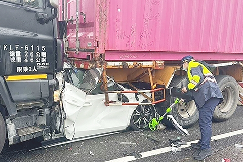 ◎ 三月三日台灣第一高速公路高雄路竹路段發生一起死亡車禍,一輛貨櫃車追撞一輛自小客車,自小客車再推撞前方貨櫃車,造成自小客車被兩輛貨櫃車夾擊,駕駛郭姓男子被救出送醫急救不治。(香港中通社圖片)