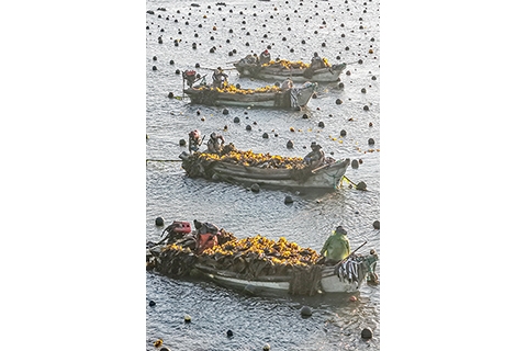 ◎ 三月九日,在山東省榮成市愛倫灣海洋牧場海帶養殖區,養殖工人收穫海帶(無人機照片)。眼下,在我國海帶主產區山東省榮成市,海洋牧場海帶養殖區一派繁忙景象。養殖戶對近岸養殖區達到成熟標準的海帶分批收割,為後期收割的海帶留出生長空間,以便提高海帶產量和質量。新華社發(李信君攝)