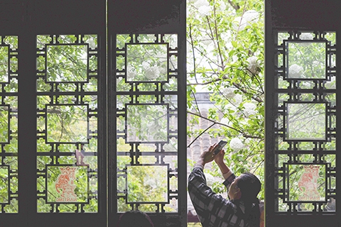 ◎ 四月八日,江蘇南京,明故宮遺址午朝門公園與清涼山崇正書院內木繡球盛放,白色花朵團團簇簇綴滿枝頭。圖為崇正書院內,木繡球與古色古香的建築相映襯。(中新社記者 泱波 攝)