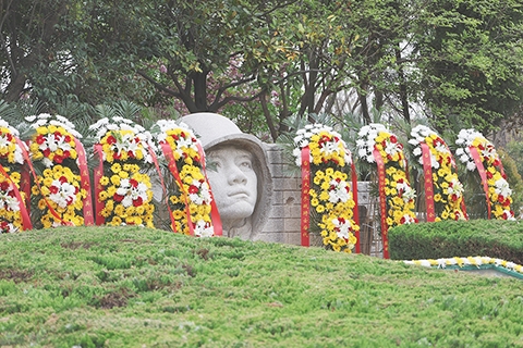 ◎ 四月八日,台兒莊大戰勝利八十八周年紀念活動在山東省棗莊市舉行,台兒莊大戰無名英雄紀念墓前襬滿花籃。(中新社記者 孫婷婷 攝)
