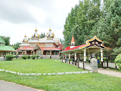 步出餐廳回望金環這座美麗的城堡,五角形皇冠造型的木質建築與阿什河畔的自然風光相映成趣,這座如童話般的俄羅斯古鎮風格的建築物相當吸引,不止以純正的俄式菜肴聞名,更將用餐場景與自然景觀深度融合,成為莊園內不可錯過的文化地標。◇(哈爾濱遊‧七)