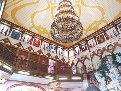 金環西餐廳不止是享受俄羅斯美食,餐廳環境也是佈置得美輪美奐的,餐廳大廳有兩層高的彩繪大廳,配上水晶吊燈,在俄羅斯巨幅油畫《春天仙子》,營造出恢弘典雅的氛圍。大廳有座很有氣勢的樓梯,有佔地廣闊的迴旋樓梯,樓梯分成左右兩部分,蜿蜒盤旋的層層疊錯落有致,柔美的水晶吊燈映照着樓梯優雅的線條,非常雅致亮麗。