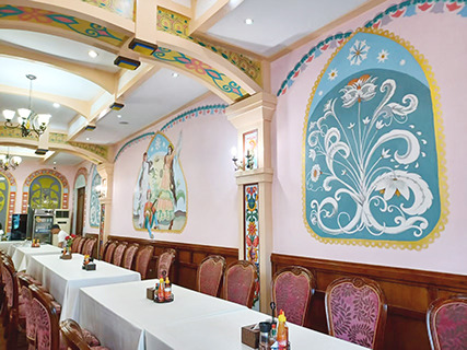 筆者初吃俄羅斯餐,是在哈爾濱的伏爾加莊園內的金環西餐廳,據說莊園內的西餐廳是國內最具俄國特色的,亦是現時國內一流的俄式餐廳,餐廳可容納逾200人同時用餐,餐廳環境富麗堂皇,金與白交叉的帳篷式屋頂充滿濃郁的異域風情,餐廳內部佈置精緻,情調高雅又極具藝術表現力,彷彿置身於藝術的殿堂。由俄羅斯廚師親自烹製的傳統道地式俄國餐,讓旅客品嘗到濃厚的俄羅斯餐飲文化。