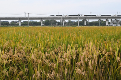 江南金秋 浙江杭州金色稻田呈現「豐收畫卷」 2025-10-29 03:30:00 ◎ 十月二十八日,一列高鐵從稻田附近駛過。江南金秋時節,浙江杭州余杭大量的稻田呈現出金黃色,並陸續開始收割,呈現秋日「豐收畫卷」。(中新社記者 王剛 攝)
