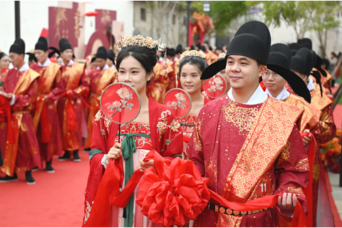 福州:百對新人辦中式傳統婚禮 2025-10-29 03:30:00 ◎ 十月二十八日,二0二五年「有福之州溫暖榕城」集體婚禮在福建福州舉行。百對新人身著唐制華服,依循傳統儀軌舉行唐制婚禮,在現場來賓的祝福聲中,開啟幸福生活的嶄新篇章。圖為新人們準備進場。(中新社記者 呂明 攝)