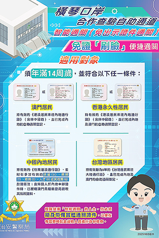 使用橫琴口岸「合作查驗自助通道」「智能通關」的人士須年滿14周歲,並符合以下任一條件: