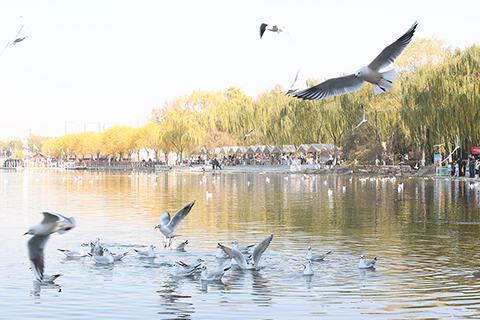 ◎ 丹江口水庫是南水北調中線工程核心水源地。深秋時節的丹江口水庫如一塊碧綠翡翠鑲嵌於漢江與丹江交匯處。水庫沿岸的不少村鎮的田間地頭,民眾忙碌著採收、售賣柑橘、獼猴桃等水果。在位於湖北丹江口市的北京一輕食品(丹江口)產業園裡,HPP柑橘汁生產線同樣忙碌,來自庫區生態果園柑橘經過超高壓處理,變身帶著鮮果清香果汁。丹江口水庫不僅滋養著民眾,更催生出一個以水為核、全鏈發展的百億級特色產業集群。丹江口水庫給民眾帶來了安居的美好生活,而民眾也用行動守護這「一庫清水」。圖為十月二十二日,小朋友在漢水文化公園打卡拍照。(中新社記者 駱雲飛 攝)
