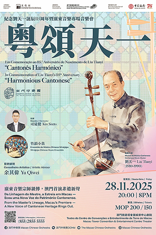 《粵頌天一》廣東音樂專場音樂會由文化局主辦,澳門樂團有限公司承辦,澳門中銀支持,門票現於澳門售票網公開發售,票價分為200及150澳門元,24小時訂票熱線28555555,網上訂票www.macauticket.com。◇