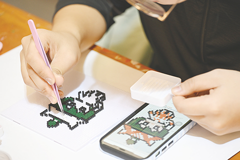 ◎ 拼豆是一種以彩色塑料豆為材料的像素風手工藝,因其解壓、成就感強和社交屬性,被稱為「年輕人的十字綉」。最近,一種名為「拼豆」的手工悄然流行起來。一把鑷子,幾盤彩色小豆,一塊帶釘的板子,就能讓不少年輕人安靜地坐上好幾個小時。拼豆的規則很簡單:找對顔色,放對位置,最後用熨斗一燙,成果就實實在在地擺在眼前。拼豆也不是一個人的遊戲,網絡上隨處可見人們分享自己的作品。圖為十一月七日,北京師範大學的趙同學在什刹海一家拼豆店裡製作自己的拼豆作品。(中新社記者 田雨昊 攝)