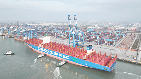 11月9日傍晚,20萬噸級集裝箱船「中遠海運雙子座」輪順利靠泊廣西北部灣港欽州自動化集裝箱碼頭9號、10號泊位,北部灣港迎來建港以來噸位最大、船長最長的集裝箱船舶。
