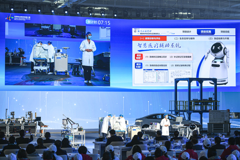 ◎ 十一月十四日晚,二0二五年世界職業院校技能大賽冠軍總決賽在天津電子信息職業技術學院舉行,大賽吸引了來自全球七十六個國家的八千九百五十六支隊伍、三萬三千餘名選手參加,最終六支隊伍脫穎而出,在冠軍總決賽舞台上展開巔峰角逐。圖為金華職業技術大學「家門口的守護:糖尿病併發症的社區精準防治」項目參賽隊獲得冠軍。(中新社記者佟郁 攝)