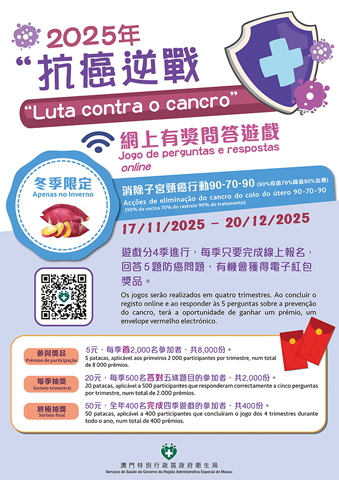 衛生局於十一月十七日開展今年最後一場「抗癌逆戰」網上有獎問答遊戲(冬季限定),透過問答形式傳遞正確的預防癌症知識。該有獎問答遊戲由十一月十七日九時至十二月二十日二十三時五十九分結束,與以往模式一樣,參加者只需回答五條關於預防癌症的簡單實用問題即有機會獲得獎勵;首二千名完成答題的居民可直接獲得獎品,若全數答對五條問題更可參加額外抽獎;此外,凡連續參加了四個季度遊戲的居民將獲「年度終極抽獎」資格,中獎結果於二0二六年一月十五日在衛生局網頁內「慢性病資訊網」的最新消息、「活力健康站」Facebook及Instagram專頁上公佈。有興趣人士可透過掃描附圖活動網頁二維碼了解活動詳情及參與遊戲。若有查詢請發送電郵至dps@ssm.gov.mo;對獎品發放有疑問,請致電MPay客戶服務熱線(二八七二七六八八)。