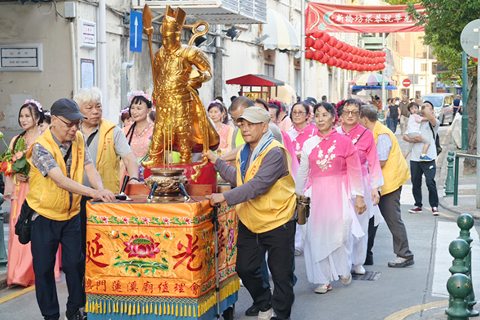 【特訊】澳門蓮溪廟值理會主辦的華光聖尊遶境活動,昨日下午四時三十分在新橋蓮溪廟前地舉行,活動得到特區政府文化發展基金的資助。業餘體育會和新橋青少年龍獅團協助。蓮溪廟值理會的多位負責人梁慶庭、陳志杰、尹根、李志遠、雷志江、杜燦榮、吳松錦、黃沛球及錢進浩等人出席。
