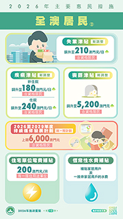 行政長官岑浩輝昨日發表二零二六年度施政報告,當中多項惠民措施將繼續落實,包括繼續發放現金分享,向合資格永久性居民發放澳門幣一萬元,並向合資格非永久性居民發放澳門幣六千元;全澳居民可享有的醫療券澳門幣七百元維持不變,並向每名合資格居民的非強制央積金個人帳戶額外注資七千元。特區政府二零二六年繼續向合資格長者發放一萬元敬老金,以及每月三千九百元的養老金。另外,本澳居民參加內地醫保制度津貼計劃,範圍擴展至廣東全省及福建省,補貼上限為澳門幣一千元。