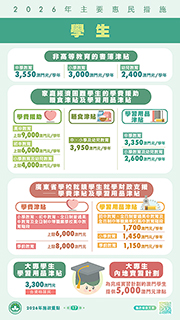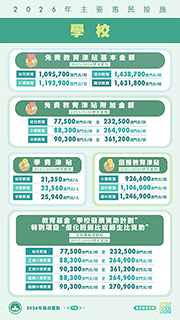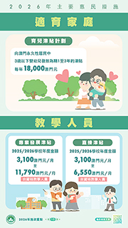 部份津貼及補貼則維持不變,包括出生津貼維持澳門幣六千五百元,合資格父母雙方可同時申請,育兒津貼亦會繼續發放,電費及水費補貼維持不變。繼續實施全民車資計劃,合資格居民購買居住單位首六百萬元豁免不動產移轉印花稅。將繼續二零二六至二零二九年新一期持續進修發展計劃,每名合資格巿民上限為澳門幣六千元。僱員方面,明年繼續減收職業稅百分之三十,一般僱員免稅額為十四萬四千元,殘疾僱員以及六十五長者僱員免稅額為十九萬八千元,並向已繳職業稅居民退還百分之六十的稅額,上限為澳門幣一萬四千元。教育方面,免費教育學費津貼、回歸教育津貼、教學人員的專業發展津貼及直接津貼、非高等教育書簿津貼、大學生學習用品津貼等將繼續發放。◇