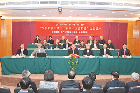 【特訊】澳門中華總商會於十一月二十日下午六時在會址舉行「學習貫徹中共二十屆四中全會精神」專題講座,中總理事長馬志毅擔任主持,邀請澳門大學社會科學院院長胡偉星擔任主講嘉賓,向與會的會長、會董、理事、監事分享他對四中全會精神的解讀。中總會長崔世昌,副會長林金城、劉藝良,監事長盧建,副理事長崔煜林、黃國勝、何佩芬、黃樹森、徐達明、蕭志偉、莫志偉、陳澤武、許樂敏、顏奕真,副監事長陳少雄、陳隆成近百人出席專題講座。