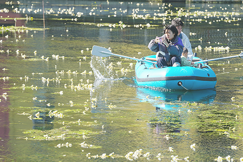 ◎ 十一月二十一日,廣西河池市都安瑤族自治縣瑋走海菜花基地,隨波蕩漾的海菜花與山水、民居交相輝映,形成「會開花的河」的絕美景致。該基地坐落于澄江河上游,每年五月至十月迎來海菜花盛花期,遊客可乘坐無動力船近距離觀賞。(中新社記者 陳冠言 攝)