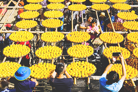 台灣新竹縣三面環山一面臨海,形成西北開口的地形,每當秋冬東北季風增強,在立冬之後,這股的強勁的季候風被稱為「九降風」。新竹縣的客家姐妹劉竹英和劉珍珠(二姐)被稱為柿餅婆婆,倆人經營著新埔「味衛佳柿餅觀光農場」,堅持傳承古法曬制柿餅,加工流程繁瑣,曬柿餅前,先將新鮮柿子洗淨削皮,再置放於網架透過日曬和利用「九降風」風乾,全程看似簡單,卻絲毫不能馬虎。劉氏姐妹個性豪邁親切,喜歡與遊客互動,不但擁有高人氣的魅力,且讓新埔成為遠近聞名的柿子故鄉。(香港中通社圖片)