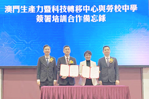 生產力中心理事長關治平與勞校中學校長鄭杰釗,在教育及青年發展局處長梁怡安及華為澳門公司副總經理朱志華的見證下,共同簽署培訓合作備忘錄。勞校中學於本學年的高中年級增設了華為人工智能(HCIA-AI)課程,課程內容涵蓋機器學習、深度學習及大模型基礎等核心知識,並結合華為的人工智能平台進行實操,協助學生掌握AI理論及應用能力,為其升學及職業發展奠定基礎。