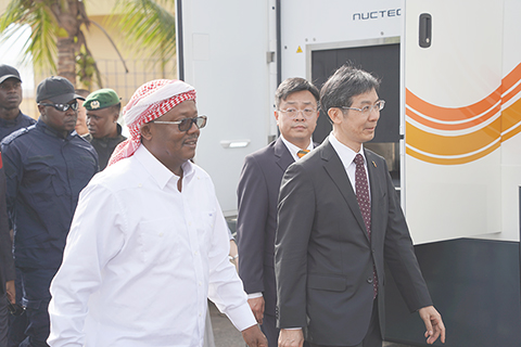 ◎ 幾內亞比紹總統恩巴洛十一月二十一日在首都比紹出席中國援助幾比機場安檢設備交接儀式,對中方給予的寶貴援助表示衷心感謝。圖為當日,幾內亞比紹總統恩巴洛(前左)在首都比紹與中國駐幾內亞比紹大使楊仁火(前右)共同參觀中國援助的多功能安檢設備。(新華社記者 司源 攝)
