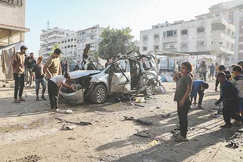 ◎ 十一月廿二日,在加沙城西部,加沙居民查看被以色列無人機炸毀的汽車。巴勒斯坦加沙地帶衛生和民防部門消息顯示,以色列當日對加沙地帶多地發動空襲,造成至少廿二人死亡、八十三人受傷,傷亡人數可能進一步上升。哈馬斯當天連發數條聲明,譴責以方,呼籲斡旋加沙停火的美國和地區國家負起責任,緊急介入制止以色列「違反人權」的行為。(新華社發 里澤克.阿卜杜勒賈瓦德 攝)