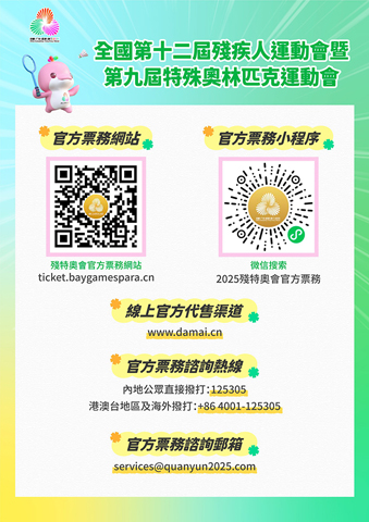 澳門賽區籌備辦公室提醒公眾應提前細閱持票須知ticket.baygamespara.cn/hant/#/news/detail/0/37,並應循官方合法渠道購票,切勿炒賣門票及向身份來歷不明人士購買門票,以免墮入騙局而招致財產損失。如在購票過程中遇到疑問,可撥打官方票務熱線(內地公眾直接撥打:125305,港澳台地區及海外撥打:+864001-125305)或發送郵件至官方票務服務郵箱(services@quanyun2025.com)查詢。如欲參閱更多賽事資料,可瀏覽賽事官方網頁www.2025nationalgames.gov.mo./zh-hant/paralympics。同時,歡迎關注「第十五屆全運會澳門賽區」Facebook專頁及「全運會殘特奧澳門賽區」微信公眾號。◇