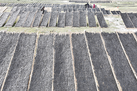 ◎ 眼下,正是「頭水」紫菜收割季。連日來,福建著名僑鄉連江縣浦口鎮一千多畝「頭水」紫菜進入集中採收期,種植戶們搶抓晴好天氣陸續收曬「頭水」紫菜。浦口鎮地處敖江入海口,得天獨厚的地理環境造就了這裡紫菜的優良品質。淡水與海水在此交匯,底質沙泥富含營養鹽,孕育出的紫菜烏黑透亮、口感鮮甜,深受市場青睞。圖為十一月二十七日,一處晾曬場正在晾曬中的紫菜。(無人機照片)(中新社記者 張斌 攝)