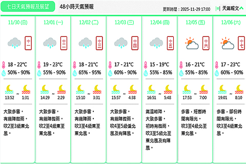 預測今日有幾陣微雨 2025-11-30 03:30:00 【特訊】地球物理氣象局消息:預測今日大致多雲。有幾陣微雨。吹二至三級東北風。氣溫約為攝氏十八至廿二度。相對濕度介乎百分之五十至九十之間。預測最高紫外線指數約為四,級別屬於中等。◇