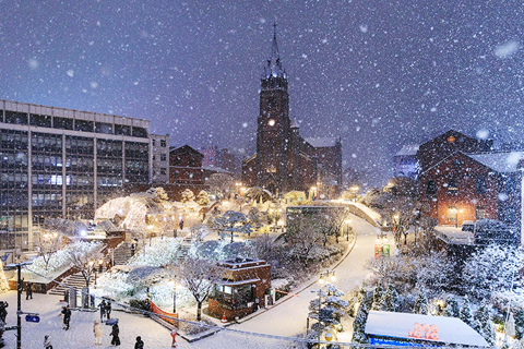 ◎ 十二月四日晚,受強冷空氣影響,首爾降下了今年入冬以來的第一場雪。圖為當日,在韓國首爾,人們在雪中出行。(新華社發 樸晉澤 攝)