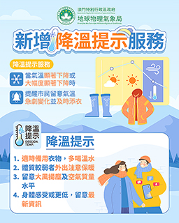 氣象局表示,「降溫提示」主要針對本澳秋冬季的氣候特點,當預測氣溫顯著或大幅顯著下降時,氣象局將提前發出降溫提示,為市民提供更豐富多元和及時的氣象資訊,讓公眾能提前採取適當預防措施,減少顯著降溫天氣對健康造成的影響。