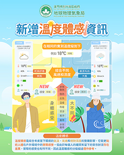 「溫度體感」將為市民提供更貼近實際感受的實時氣象資訊。該資訊結合實時氣溫、濕度、風速等氣象要素,計算出當刻天氣狀況下,一般人在戶外環境中較常出現的實際感受,並據此調整衣著及活動安排。無論是日常出行、戶外工作或休閒活動,市民均可透過此資訊獲得更實用的氣象參考,進一步提升生活品質。