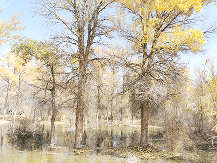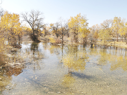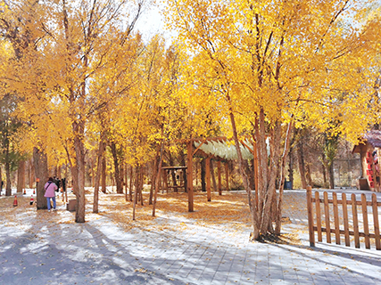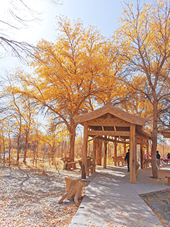 遊覽當天,可以發現景區內有亭、樓、棧道、人工湖。在核心區的金波湖水域,與胡楊林相互暉映,景致十分美麗。區內築有裝上觀光電梯的胡楊樓、烽燧瞭望台及胡楊文化館等景觀設施,令遊客可以在不同的角度去欣賞這片在秋日裡的胡楊林。金黃色的胡楊林,樹影倒映在金波湖的湖水裡,流光溢彩,是一處最佳的拍攝場景,湖畔時有三三兩兩水禽悠閒地暢泳其間;秋風乍起,胡楊金黃的落葉,飄灑到地上,使大地金黃一片;或飄落到湖裡,順水而去,顯得輝煌而凝重,一幅秀麗的秋日湖景,讓漫步其間的遊人,沐浴於金色的世界裡,彷彿進入了人間仙境。
