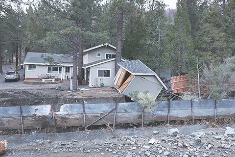 ◎ 美國加利福尼亞州廣大地區聖誕節假日期間持續遭受「大氣河」引發的強風暴襲擊。截至十二月二十五日上午,已至少有三人死亡,十二萬戶居民處於停電狀態。加州政府已宣佈多地進入災害緊急狀態。圖為二十五日在美國加利福尼亞州聖貝納迪諾縣賴特伍德拍攝的一處受損建築物。(新華社發 邱晨 攝)