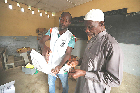 ◎ 科特迪瓦國民議會選舉投票十二月二十七日上午在全國展開,將選舉產生新一屆國民議會共二百五十五名議員。初步計票結果將於二十八日至三十日公佈。科特迪瓦國民議會最終組成名單將於二0二六年一月十六日前公佈。圖為二十七日,在科特迪瓦經濟首都阿比讓的一處投票站,一名工作人員為選民講解投票規則。(新華社發 伊萬.宋 攝)