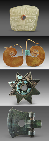 ◎ 拼版照片:陜西清澗後劉家塔墓地出土的玉獸面飾、金耳環、鑲綠松石銅飾以及瓦窯溝墓地出土的銅鉞(由上至下,資料照片)。(新華社發)