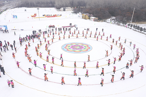◎ 十二月三十日,在青海省互助土族自治縣,土族民眾在威遠鎮卓扎灘村身著盛裝跳起安召舞,祈福新年五榖豐登、吉祥如意。(無人機照片)(中新社)