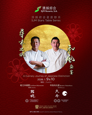 澳娛綜合度假股份有限公司1月9日及10日呈獻「澳娛綜合星廚聯乘:尋味之旅和風盛宴」,帶來和食盛會。澳娛綜合旗下榮獲米芝蓮一星餐廳「瑞兆」將首度攜手東京米芝蓮二星食府「久丹」(Kutan)於澳門上葡京綜合度假村聯袂獻技,以精湛「割烹」及「懷石」料理手藝,引領賓客投入至臻匠心之味。