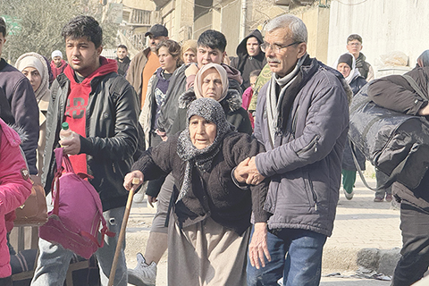 ◎ 敘利亞庫爾德武裝主導的「敘利亞民主力量」與敘過渡政府部隊一月七日在敘北部阿勒頗省首府阿勒頗市的武裝衝突持續升級,造成包括平民在內的多人傷亡、大量民眾逃離。「敘利亞民主力量」當日發表聲明說,阿勒頗市謝赫.馬克蘇德街區和阿什拉菲耶街區自當天十五時起遭到「與過渡政府相關聯的武裝派別」的「猛烈襲擊」,「敘利亞民主力量」正在予以回擊。圖為七日,在敘利亞北部阿勒頗市,人們從謝赫·馬克蘇德街區和阿什拉菲耶街區逃離(手機照片)。(新華社發)