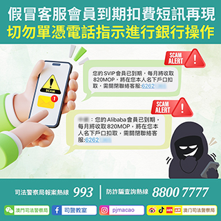 【特訊】司警局於昨日(一月九日)發現有騙徒再次假冒銀行發送虛假短訊,訛稱客戶會員到期並即將收費,如要取銷需按指示聯絡客服辦理。上述詐騙手法與去年在本澳首現並高發的假冒平台客服電話詐騙相同,倘市民誤信短訊內容主動聯繫假客服,騙徒將會以驗證身份、辦理退費等理由要求市民進行視頻通話、分享屏幕、提供個人及銀行帳戶資料、甚至轉帳至指定帳戶等操作,藉此詐騙市民金錢。