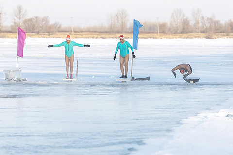 ◎ 一月十三日,在黑龍江省齊齊哈爾市,冬泳愛好者在戶外冬泳。正值「三九」天,黑龍江省的冬泳愛好者熱情不減,堅持冬泳。(新華社發 王勇剛 攝)