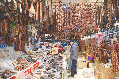 ◎ 一月十四日,春節臨近,四川成都青羊區新開寺街臘味飄香。這條素有「香腸臘肉一條街」美譽的街巷,店舖內外掛滿香腸、臘肉等腌臘製品,濃郁臘香引民眾或遊客置辦年貨忙,提前鎖定新春滋味。圖為成都新開寺街一商舖內掛滿了香腸、臘肉等腌臘食品。(中新社記者劉忠俊 攝)
